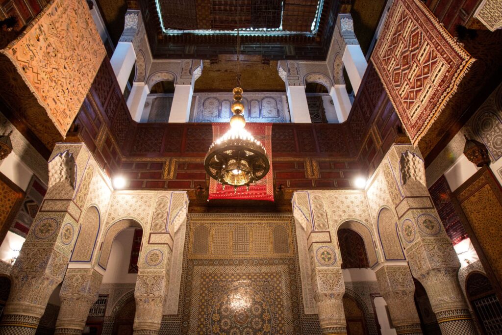 Dar Seffarine in Fez exemplifies the city’s historic riads, featuring soaring columns, carved plasterwork, and a stunning rooftop with uninterrupted views over the ancient medina.